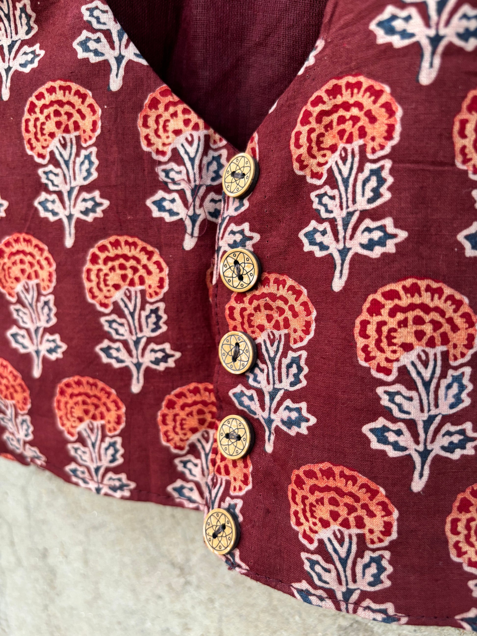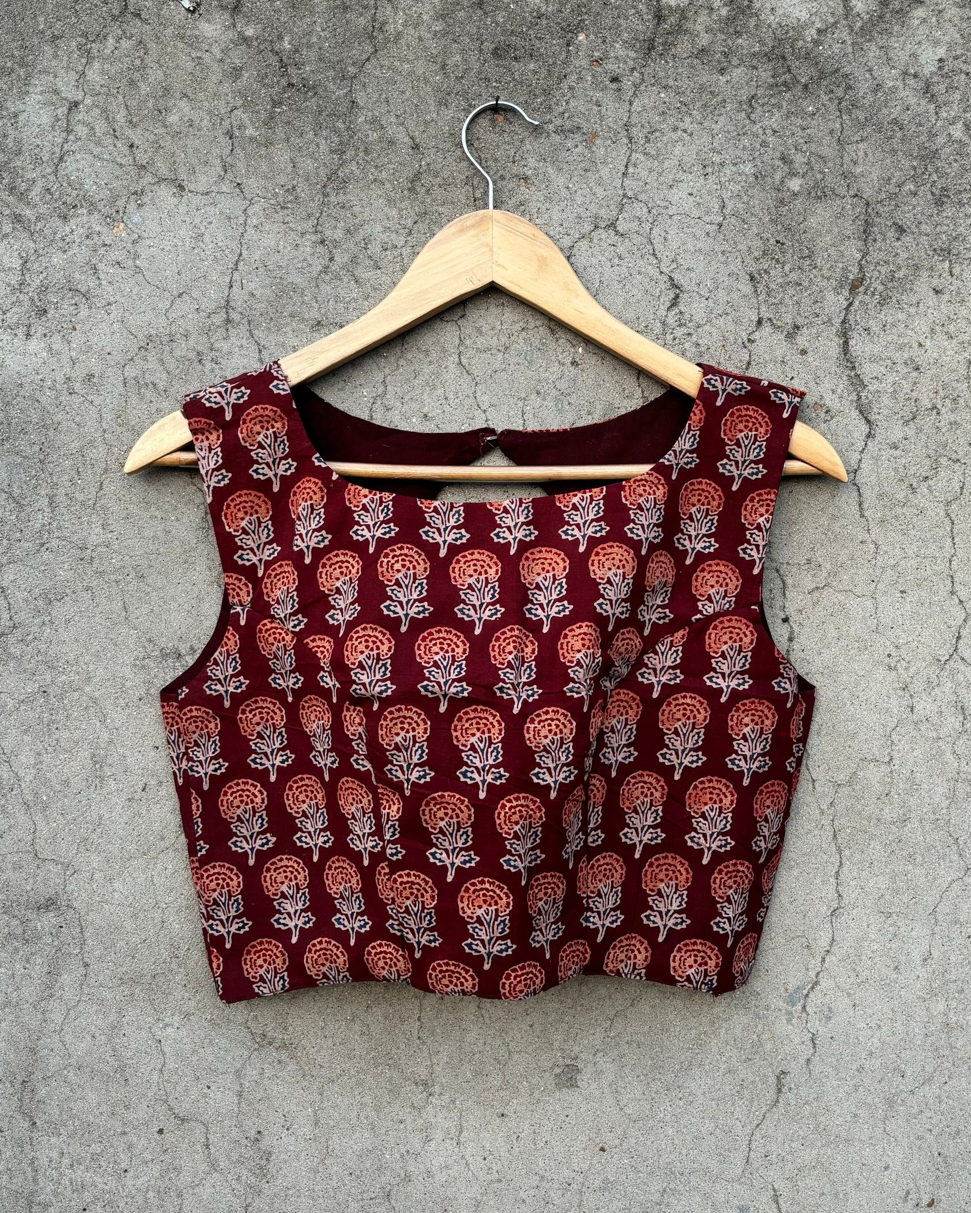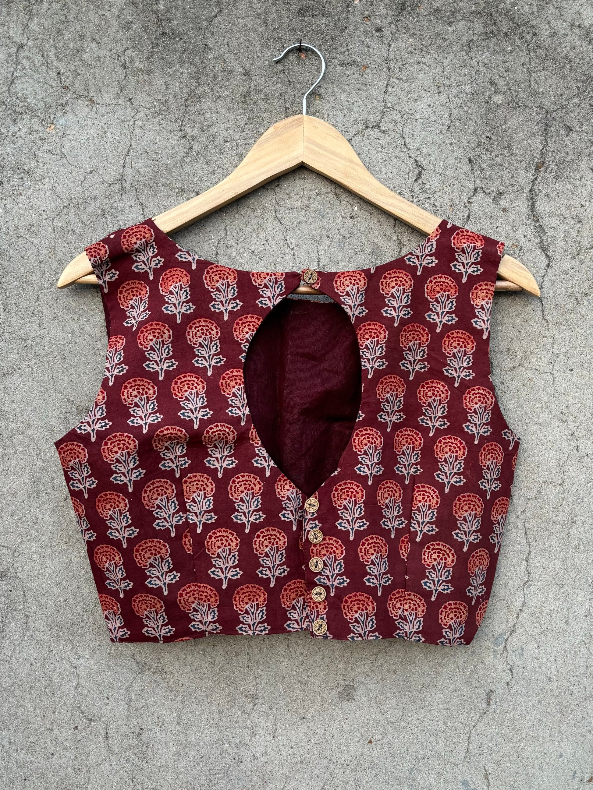 This sleeveless boat neck blouse features a classic Ajrakh print in rich brown. Designed with a comfortable lining and wooden buttons, it’s both beautiful and ideal for everyday wear. Dry clean only.