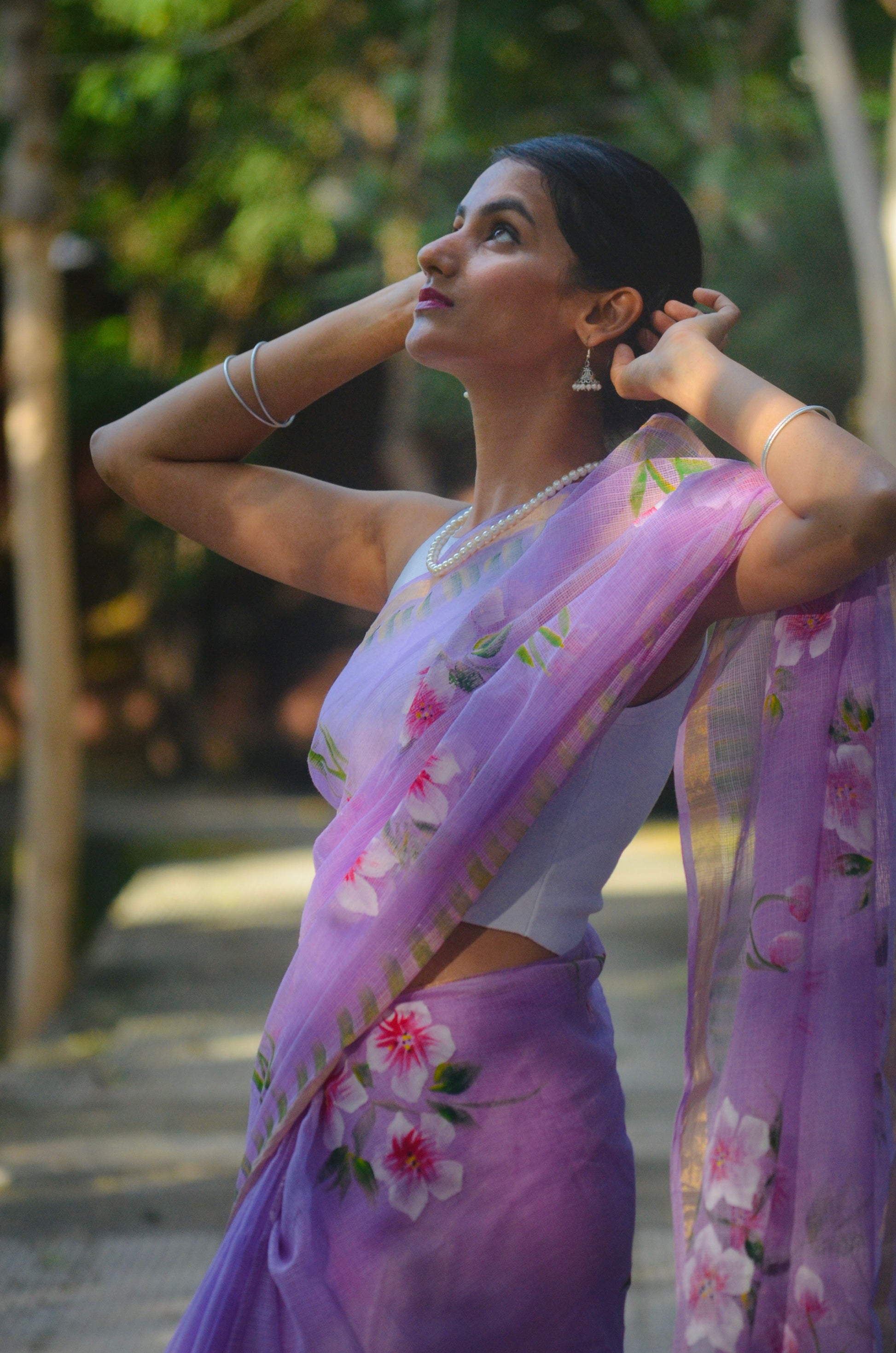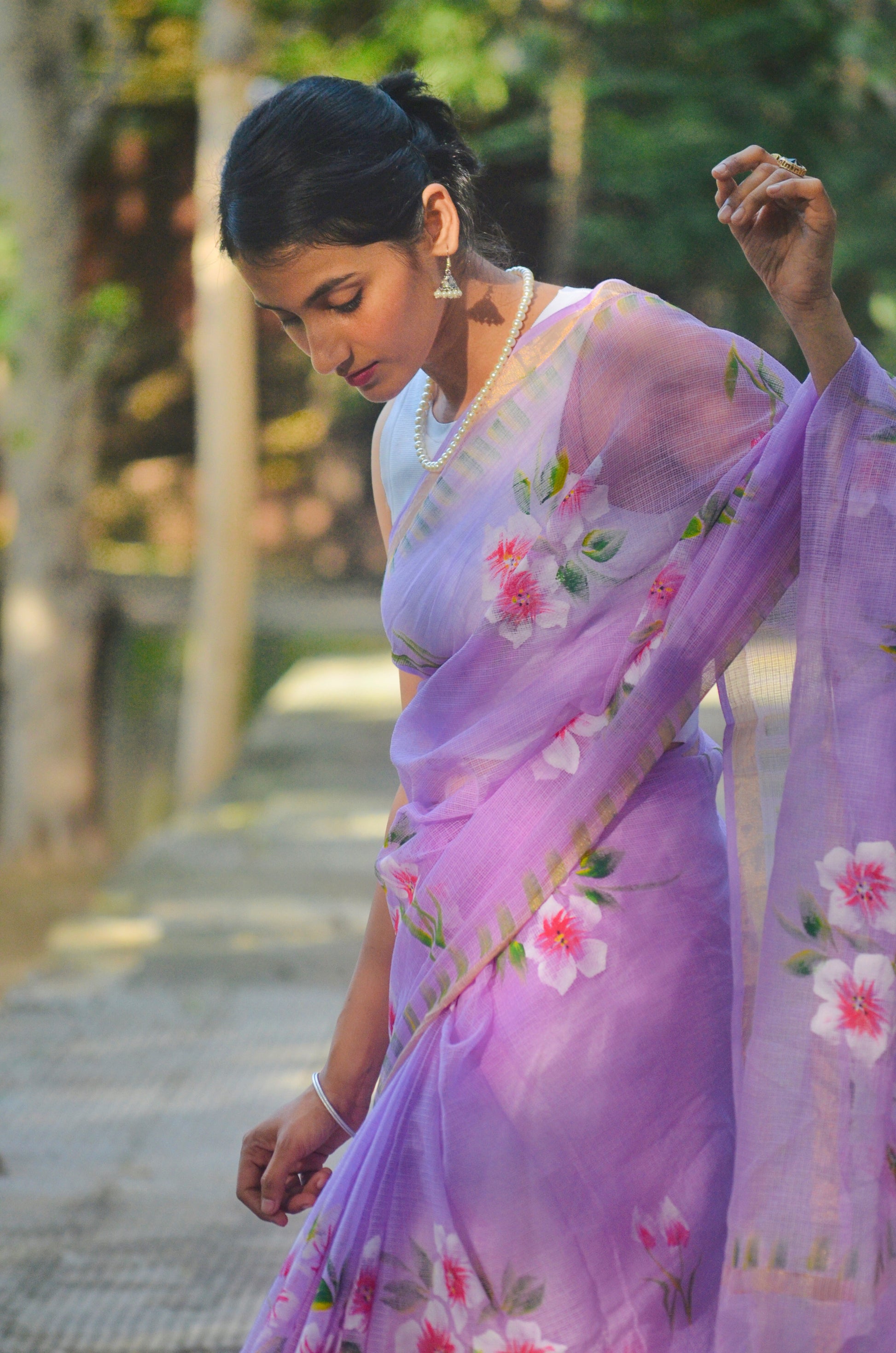 A beautiful and elegant easy-breezy pure kota doria cotton hand-painted saree in light lavender, perfect for both everyday and special occasions. Comes with a running blouse. Dry-clean only.