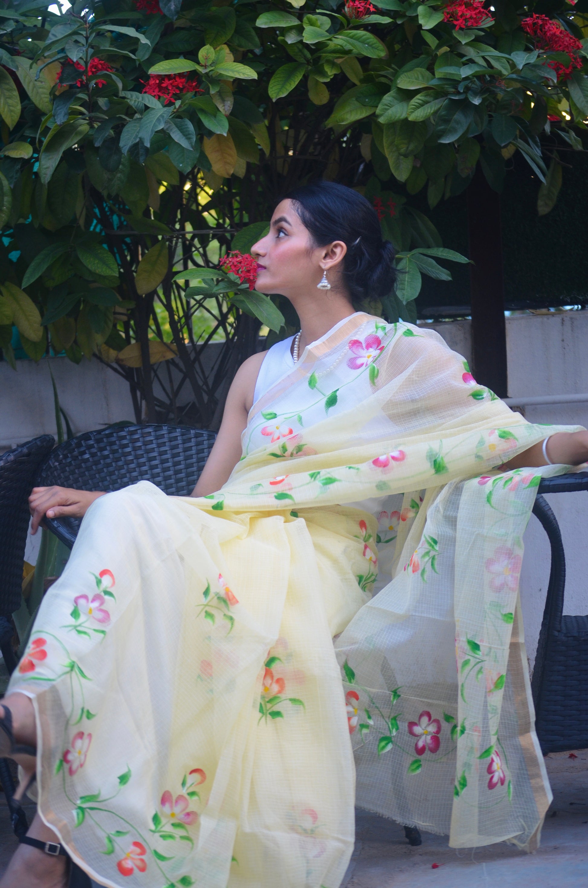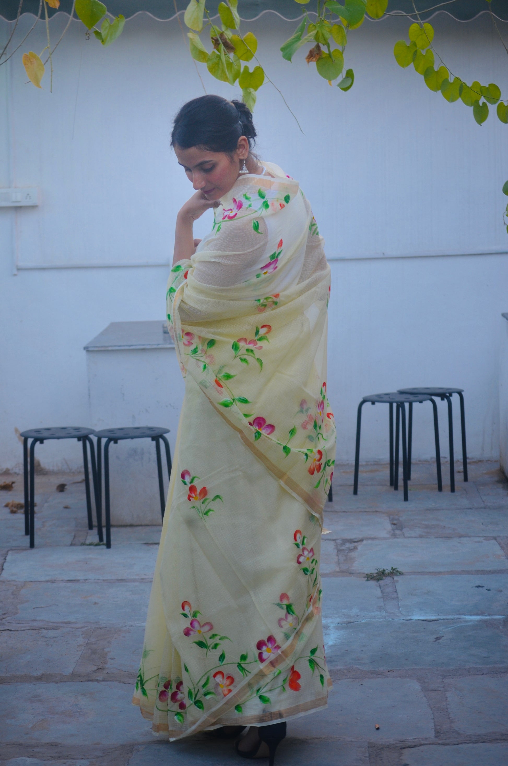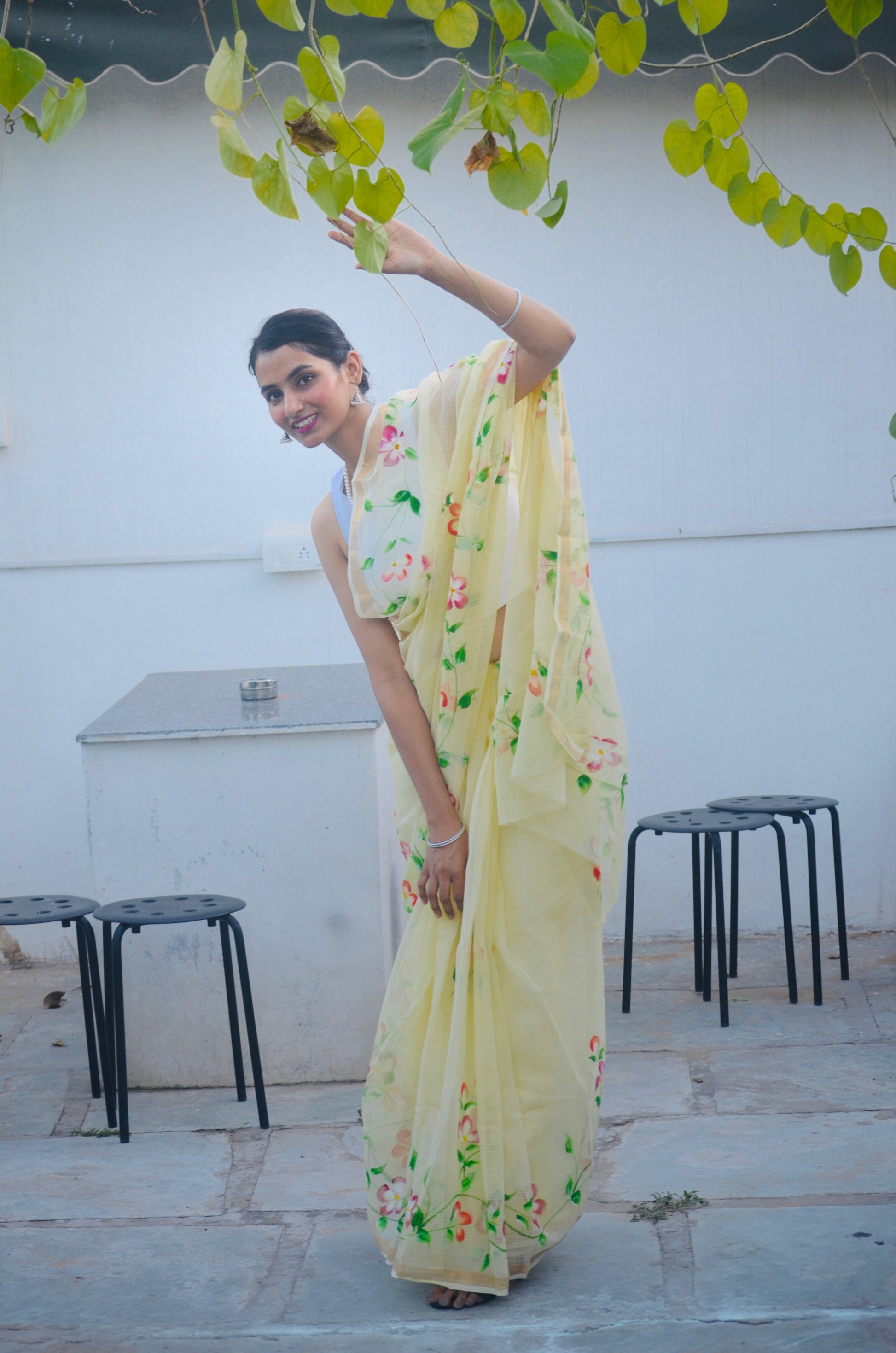 A beautiful and elegant easy-breezy hand-painted pure Kota-Doria cotton saree in pastel lime yellow perfect for everyday and special occasions. Comes with a running blouse. Dry-clean Only.