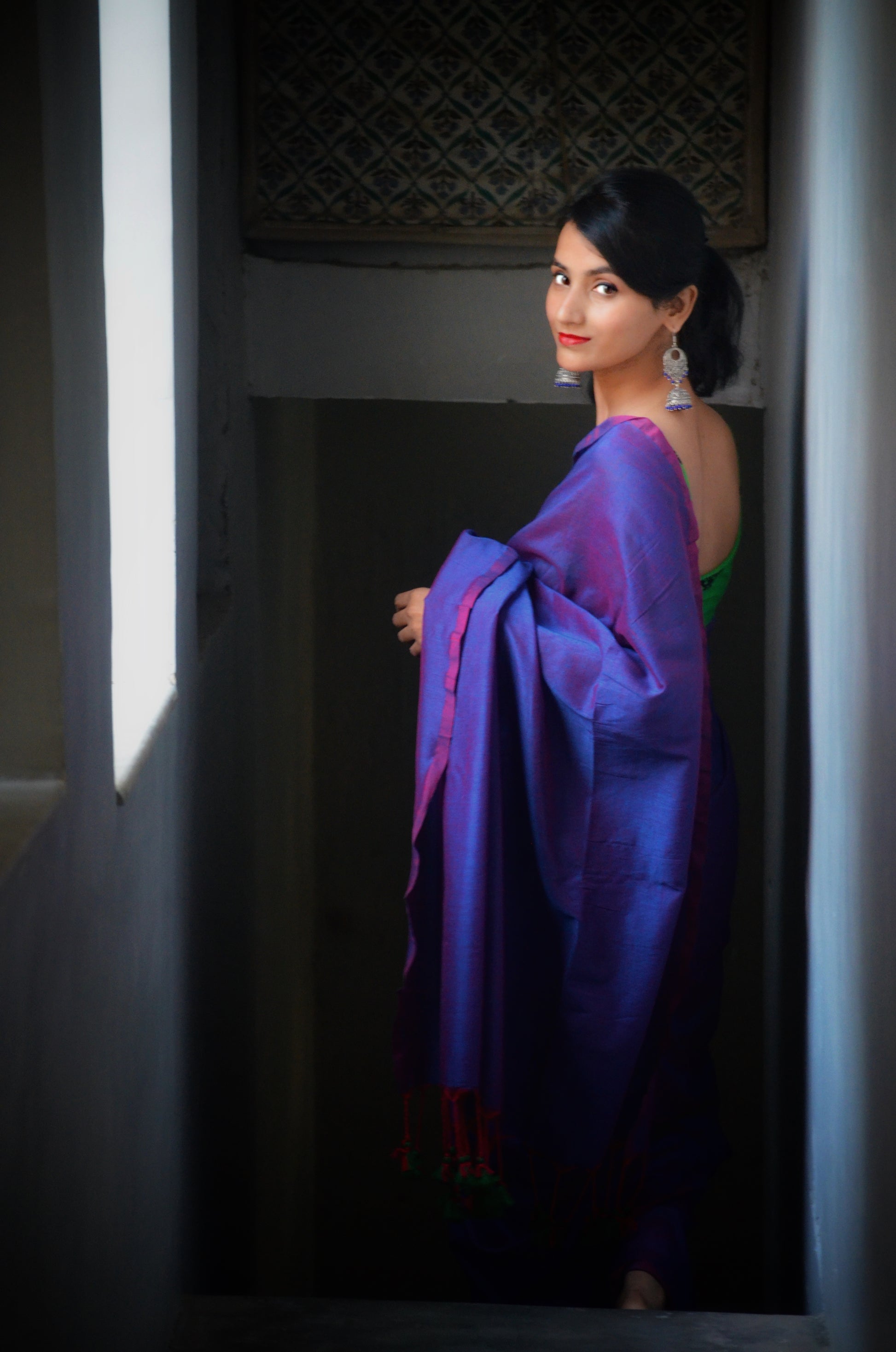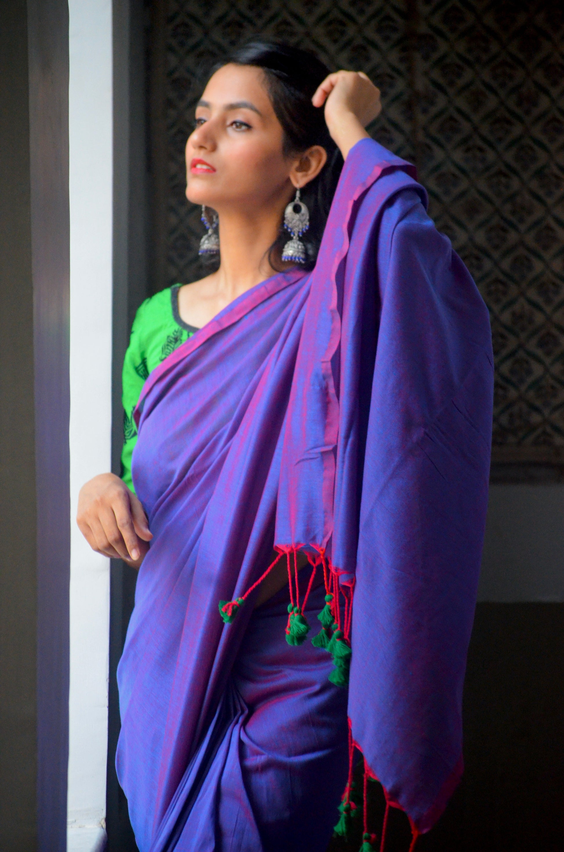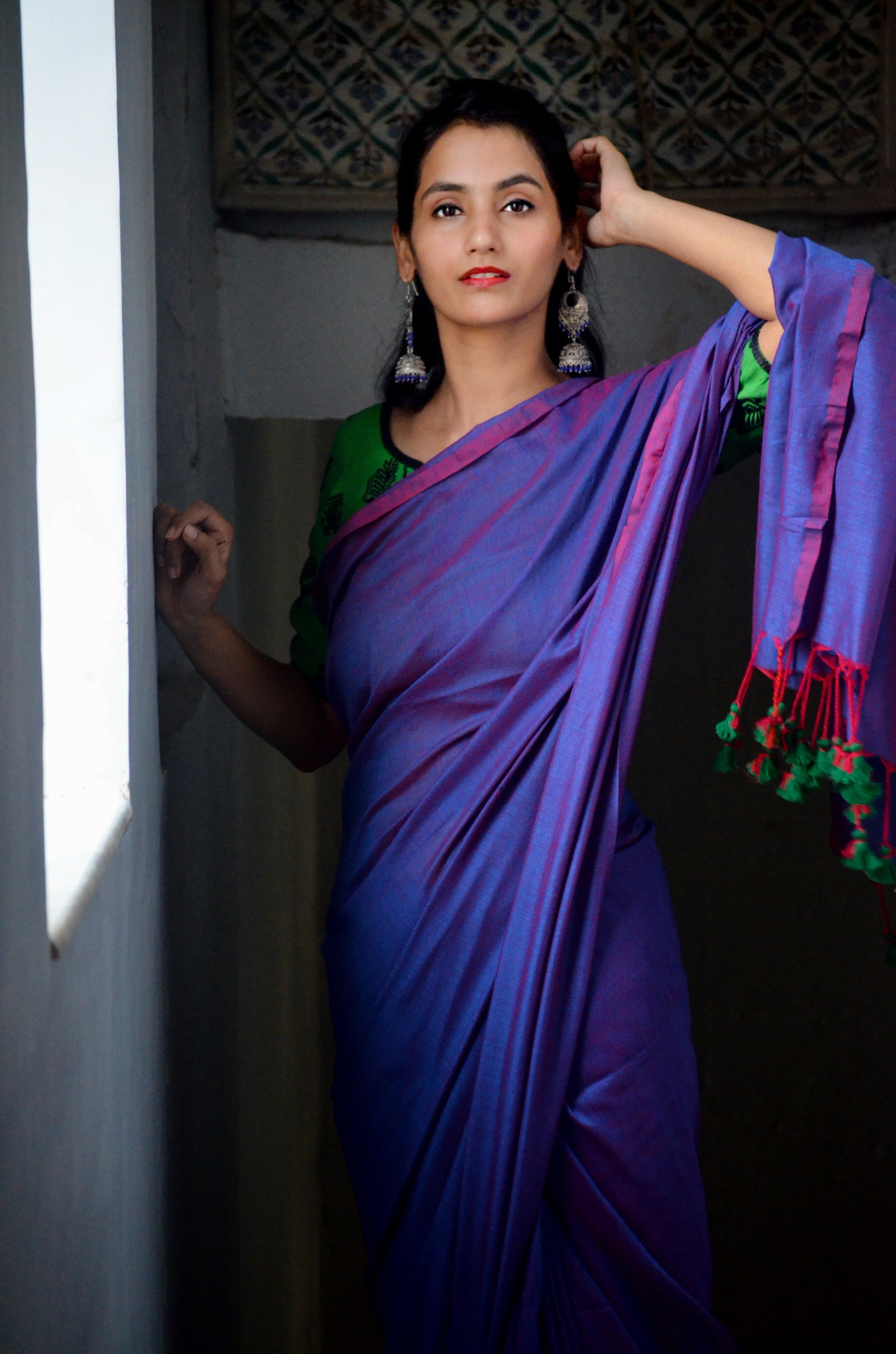 Embrace grace and beauty with this exquisite purple dual-tone khadi saree. Made from high quality fabric, adorned with red and green tassels.
