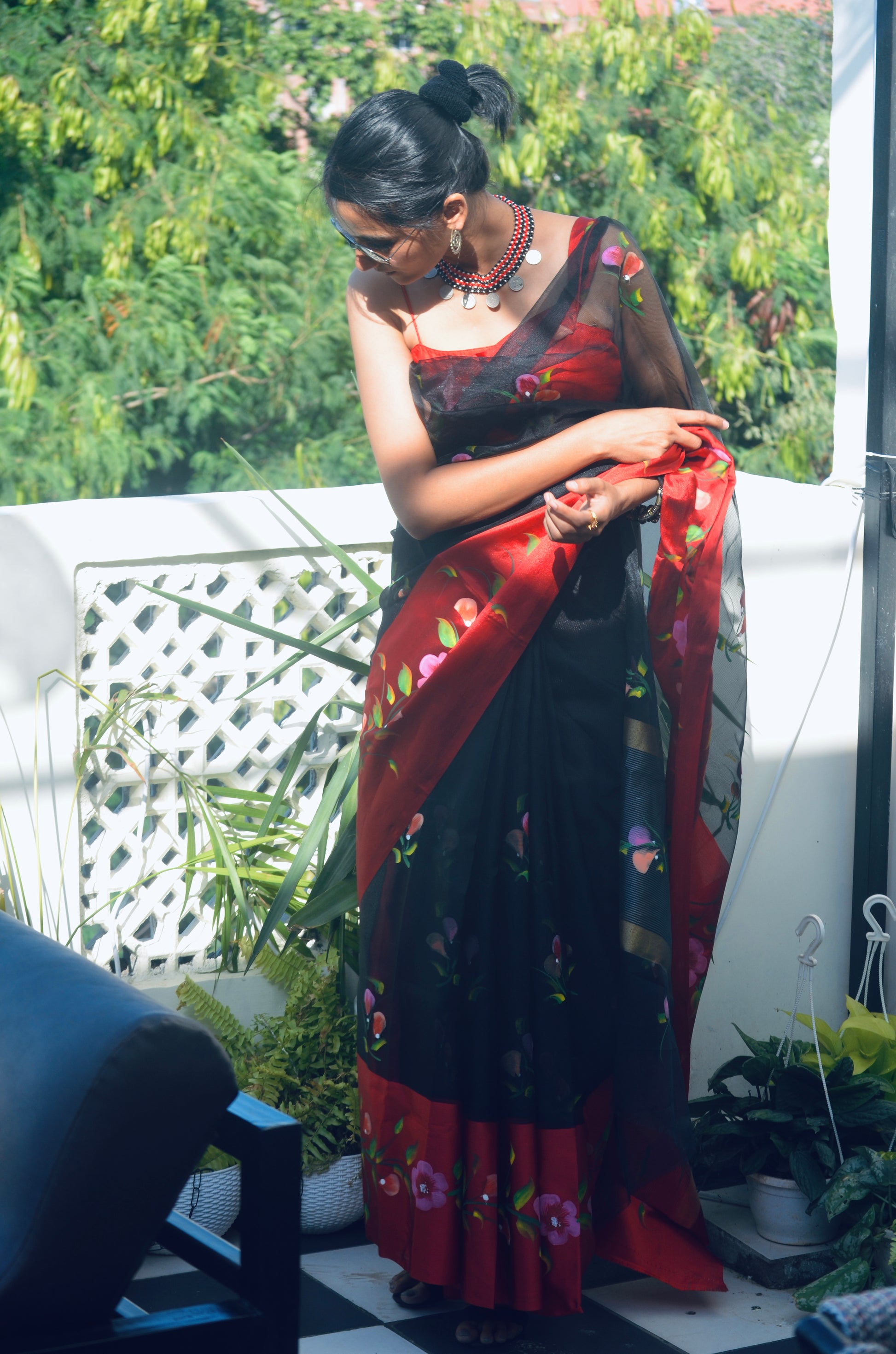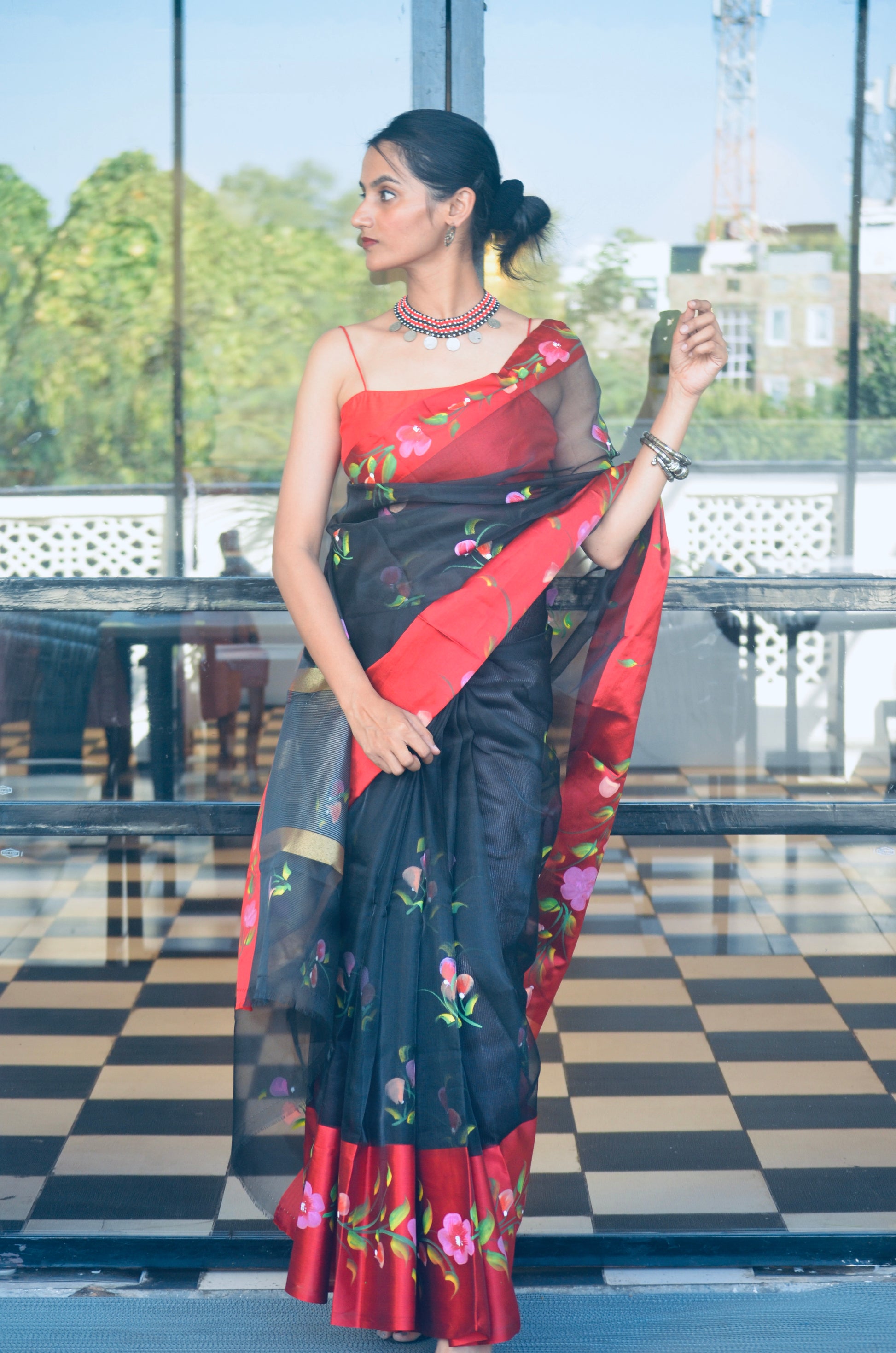 This stunning saree features black organza with handpainted details and a deep red satin border. Lightweight and easy to drape, it comes with a matching blouse, offering effortless elegance and comfort for both special and casual occasions.